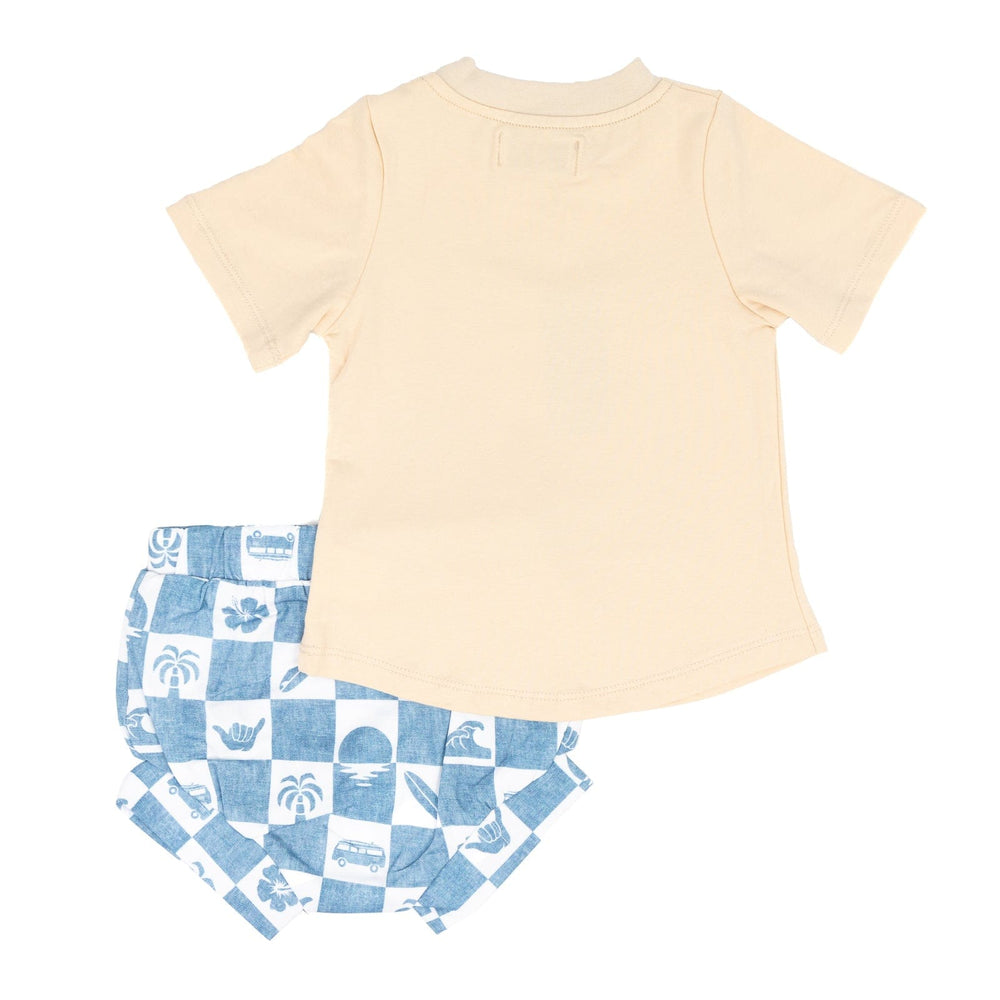 Make a splash at your local splash pad with the fun and stylish Chris set! Spread fun summer vibes with this matching graphic tee and surf-themed checkerboard pattern shorts, it's a no-brainer pickup for your next picnic, playdate, pool party, or vacation in paradise!