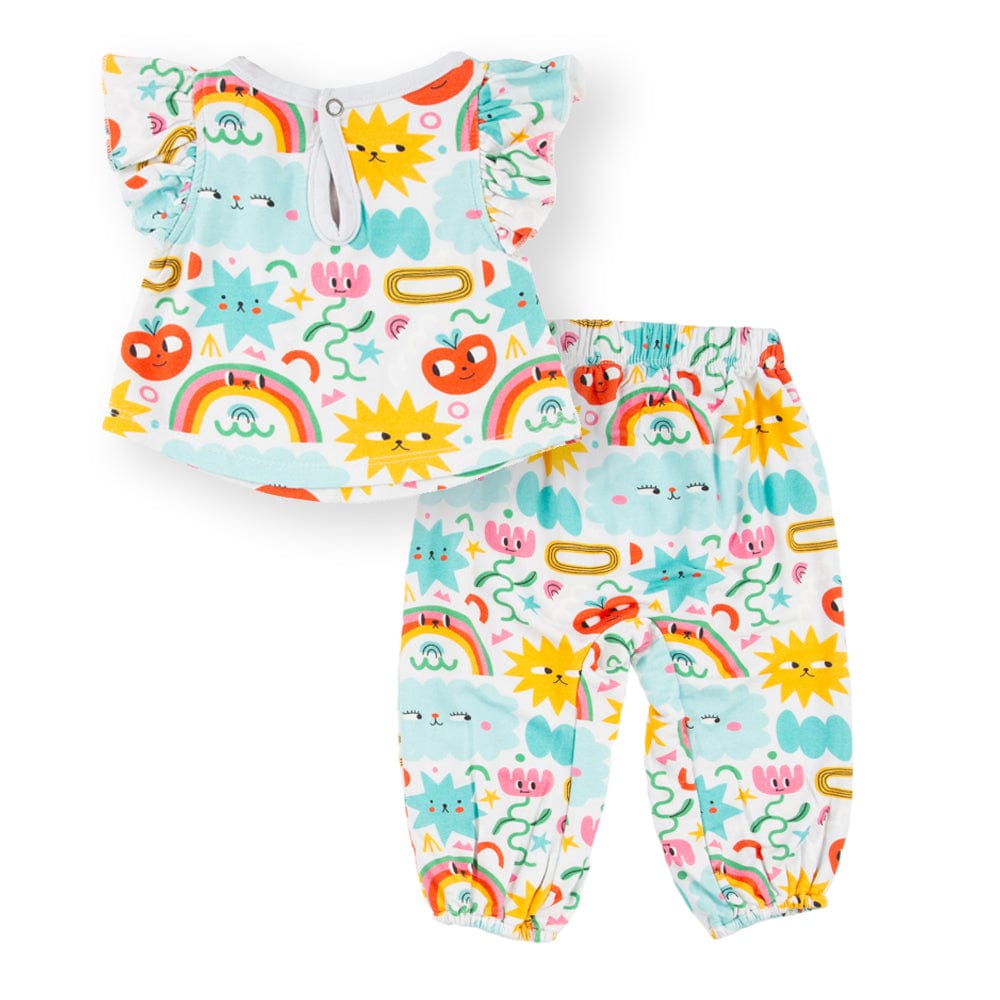 Get ready for a rainbow of fun with the sweet and cozy Yasi Layette Set. Featuring a short-sleeve top with ruffled shoulders and a matching romper bottom, it offers both comfort and style for little ones, plus the easy-to-wear design ensures quick changes for parents.